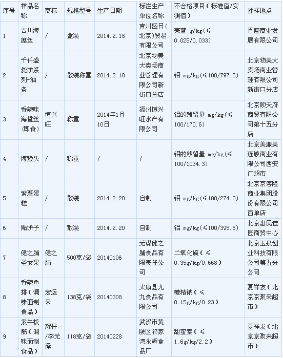 北京市食品藥品監(jiān)督管理局(以下簡稱:北京市食藥監(jiān)局)昨日通報12種不合格食品全市停售,其中發(fā)現(xiàn)“健之脯”牌健之脯圣女果二氧化硫超標。此外還發(fā)現(xiàn):燒餅系列-油條、香辣味海蜇絲(即食)、海蟄頭、海蟄頭等鋁超標,吉川海藻絲亮藍超標,香辣魚排(調(diào)味面制食品)糖精鈉超標,