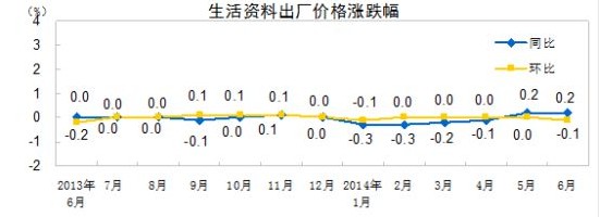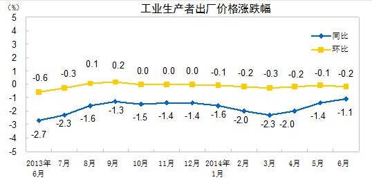 2014年6月份,全國工業(yè)生產(chǎn)者出廠價(jià)格同比下降1.1%,環(huán)比下降0.2%。工業(yè)生產(chǎn)者購進(jìn)價(jià)格同比下降1.5%,環(huán)比下降0.1%。上半年,工業(yè)生產(chǎn)者出廠價(jià)格同比下降1.8%,工業(yè)生產(chǎn)者購進(jìn)價(jià)格同比下降2.0%。