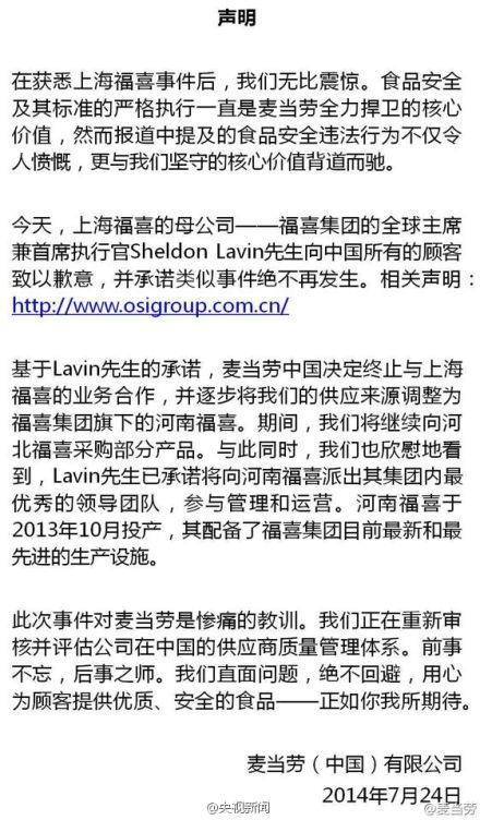 @央視新聞:#麥當(dāng)勞肯德基供應(yīng)商被曝光#【麥當(dāng)勞終止與上海福喜的合作】@麥當(dāng)勞 今晨發(fā)布聲明稱,上海福喜母公司福喜集團(tuán)全球主席兼首席執(zhí)行官向中國所有顧客致歉,并承諾類似事件絕不發(fā)生;谄涑兄Z,麥當(dāng)勞中國決定終止與上海福喜的業(yè)務(wù)合作,并將供應(yīng)來源調(diào)整為福喜旗下的河南福喜。(央視記者陳雯 王殿甲)