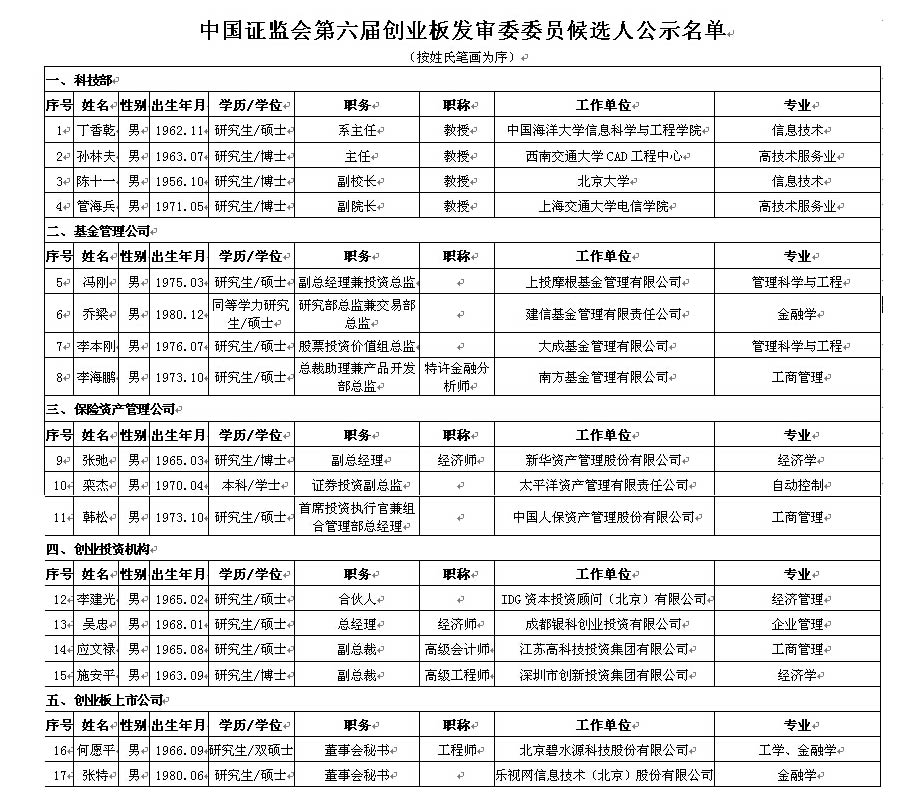 根據(jù)《中國(guó)證券監(jiān)督管理委員會(huì)發(fā)行審核委員會(huì)辦法》(證監(jiān)會(huì)令第62號(hào)),第五屆創(chuàng)業(yè)板發(fā)審委將于近期屆滿(mǎn)。我會(huì)決定對(duì)委員進(jìn)行部分更換。各單位依程序向我會(huì)推薦了17名委員候選人,F(xiàn)將第六屆創(chuàng)業(yè)板發(fā)審委17名委員候選人名單予以公示(詳見(jiàn)附件)。