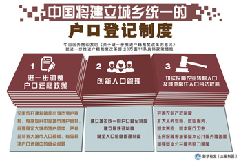 我國實行了半個多世紀的“農業(yè)”和“非農業(yè)”二元戶籍管理模式將退出歷史舞臺。7月30日,備受關注的國務院《關于進一步推進戶籍制度改革的意見》(以下簡稱《意見》)公之于眾!兑庖姟诽岢觯瑢⒔⒊青l(xiāng)統(tǒng)一的戶口登記制度,進一步調整戶口遷移政策,擴大基本公共服務覆蓋面。