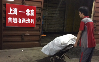 京東工作人員正往京滬電商專列上裝貨