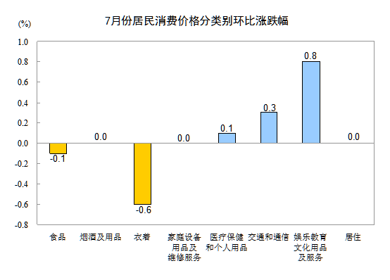 7月份,全國居民消費價格總水平環(huán)比上漲0.1%。其中,城市上漲0.1%,農(nóng)村持平(漲跌幅度為0,下同);食品價格下降0.1%,非食品價格上漲0.1%;消費品價格下降0.1%,服務(wù)價格上漲0.5%。