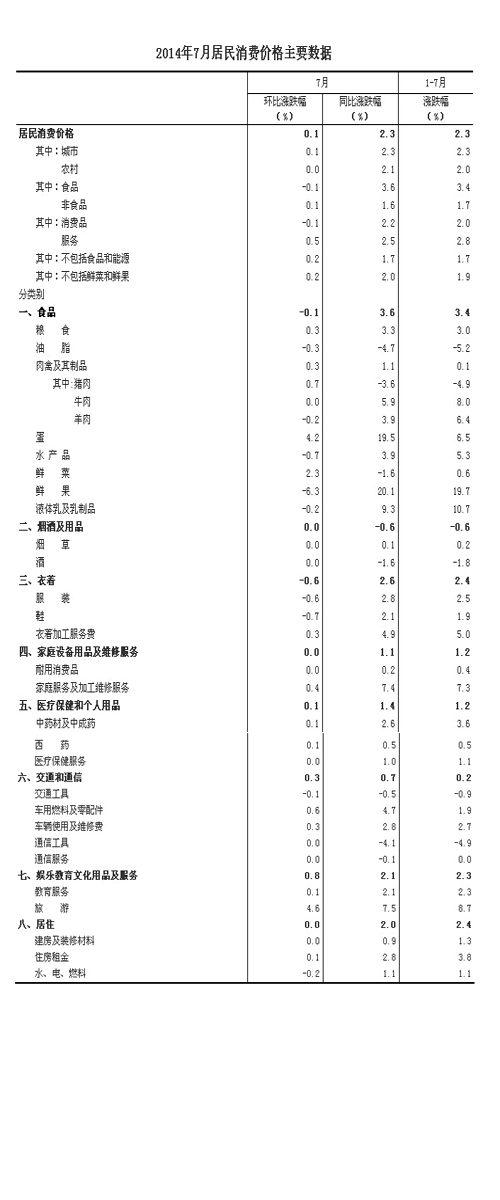 2014年7月份,全國居民消費價格總水平同比上漲2.3%。其中,城市上漲2.3%,農(nóng)村上漲2.1%;食品價格上漲3.6%,非食品價格上漲1.6%;消費品價格上漲2.2%,服務(wù)價格上漲2.5%。1-7月平均,全國居民消費價格總水平比去年同期上漲2.3%。