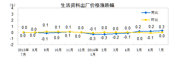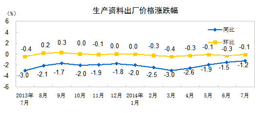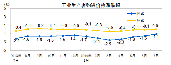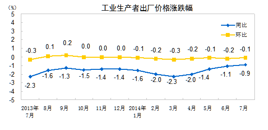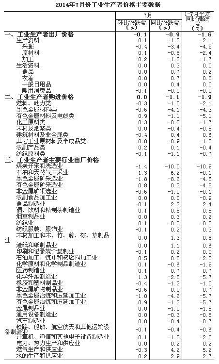2014年7月份,全國工業(yè)生產(chǎn)者出廠價格同比下降0.9%,環(huán)比下降0.1%。工業(yè)生產(chǎn)者購進(jìn)價格同比下降1.1%,環(huán)比持平(漲跌幅度為0,下同)。1-7月平均,工業(yè)生產(chǎn)者出廠價格同比下降1.6%,工業(yè)生產(chǎn)者購進(jìn)價格同比下降1.9%。