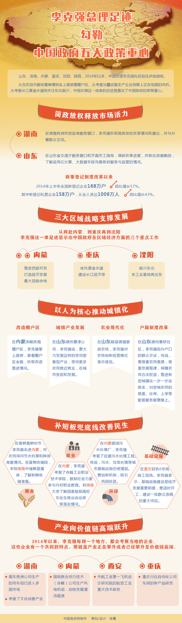 山東、湖南、內(nèi)蒙、重慶、沈陽、陜西,2014年以來,中國總理李克強先后前往多地調(diào)研。