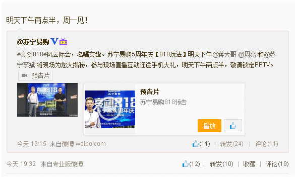 昨日蘇寧易購官微稱將于8月4日,即今日通過PPTV發(fā)布蘇寧易購818新玩法,蘇寧云商運(yùn)營總部執(zhí)行副總裁李斌微博透露發(fā)布時(shí)間為今日下午兩點(diǎn)半。記者聯(lián)系蘇寧易購市場人士,其證實(shí)PPTV將現(xiàn)場直播“亮劍818”高端訪談節(jié)目,屆時(shí)李斌現(xiàn)場將詳細(xì)釋疑百日會戰(zhàn)和818玩法懸疑。