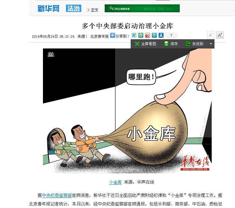 據(jù)中央紀(jì)委監(jiān)察部官網(wǎng)消息,新華社于近日全面啟動(dòng)嚴(yán)肅財(cái)經(jīng)紀(jì)律和“小金庫(kù)”專項(xiàng)治理工作。據(jù)記者統(tǒng)計(jì),本月以來(lái),經(jīng)中央紀(jì)委監(jiān)察部官網(wǎng)通報(bào),包括水利部、商務(wù)部、中石油、質(zhì)檢總局、稅務(wù)總局、衛(wèi)計(jì)委、新華社等單位紛紛啟動(dòng)“小金庫(kù)”治理。