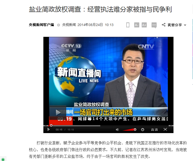 2014年8月24日,中央電視臺新聞頻道“新聞直播間”欄目報道部分省市鹽業(yè)公司、鹽務管理局經(jīng)營執(zhí)法難分家被指與民爭利,壟斷早已開放多年的工業(yè)鹽市場。