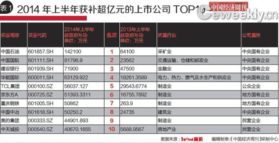《中國經(jīng)濟(jì)周刊》中國經(jīng)濟(jì)研究院根據(jù)Wind資訊數(shù)據(jù)統(tǒng)計發(fā)現(xiàn),在公布2014年半年報的上市公司中,有88.1%的上市公司收到政府補(bǔ)助,部分公司所獲政府補(bǔ)助甚至遠(yuǎn)遠(yuǎn)高于歸屬于母公司股東的凈利潤。這些公司遍布制造業(yè)、金融業(yè)、房地產(chǎn)業(yè),其中有中央國有企業(yè)也有民營企業(yè)。一些地方政府甚至定期為被打上退市風(fēng)險警示的公司發(fā)放政府補(bǔ)助,企業(yè)因此“扭虧為盈”。