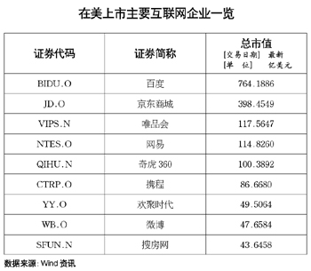 實(shí)際上,除了阿里巴巴之外,近年來,大量的互聯(lián)網(wǎng)企業(yè)在海外相繼上市。美國(guó)當(dāng)?shù)貢r(shí)間5月22日,京東正式在納斯達(dá)克掛牌上市,股票代碼為“JD”,截至記者發(fā)稿時(shí),京東的市值已經(jīng)達(dá)到了398億美元。WIND統(tǒng)計(jì)數(shù)據(jù)顯示,截至目前,在港上市的騰訊控股市值為11555億港元,在美上市的百度和奇虎360的市值則分別為764億美元和100億美元。按照目前的匯率計(jì)算,僅上述4家互聯(lián)網(wǎng)企業(yè),其市值就已經(jīng)達(dá)到1.69萬億元人民幣。