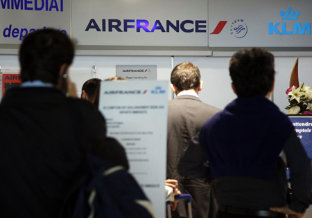 法航飛行員于15日起舉行為期一周的罷工,以抗議公司削減開支、發(fā)展廉價(jià)航空的計(jì)劃。法航在官網(wǎng)說(shuō)大約有48%的航班可以在15日起飛,不過(guò)不排除還有最后變動(dòng)的可能。 圖為當(dāng)日在法國(guó)尼斯國(guó)際機(jī)場(chǎng),乘客在法航值機(jī)柜臺(tái)旁等待辦理手續(xù)。