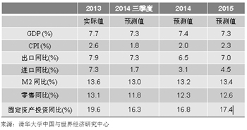 這一表態(tài)和最近幾天一些智庫機構(gòu)的預(yù)測較為接近。清華大學中國與世界經(jīng)濟研究中心公布的四季度報告稱:2014年二季度經(jīng)濟增長速度的回升并沒有延續(xù)到第三季度。7月以來,拉動GDP增長的三駕馬車中投資和消費的增長速度相對今年上半年和全年同期都有所下降,與之相對的,外需有所恢復(fù)帶來了出口的整體回升,為中國經(jīng)濟維持比較快的增長速度提供了一定支持。根據(jù)模型預(yù)測,2014年GDP全年增速7.4%。