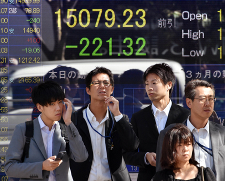 在隔夜美國股市大幅收跌和美元匯率走軟等多重利空因素拖累下,14日東京股市低開低走,日經(jīng)225種股票平均價(jià)格指數(shù)收盤時(shí)比前一個(gè)交易日大跌2.38%,失守15000點(diǎn)關(guān)口。 圖為當(dāng)日東京行人經(jīng)過顯示股價(jià)的屏幕前。