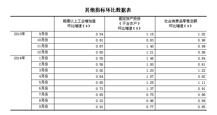 (2)根據(jù)季節(jié)調(diào)整模型自動修正結(jié)果,對近一年來各期國內(nèi)生產(chǎn)總值、規(guī)模以上工業(yè)增加值、固定資產(chǎn)投資(不含農(nóng)戶)、社會消費品零售總額環(huán)比增速進行修訂。修訂結(jié)果及2014年三季度GDP環(huán)比數(shù)據(jù)、2014年9月份其他指標環(huán)比數(shù)據(jù)如下: