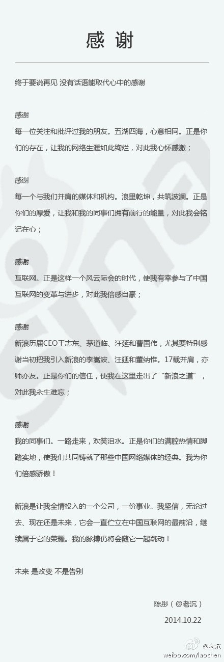陳彤在微博上寫道:“即將告別新浪;赝17年路程,往事歷歷如昨,心中千言萬語。謹(jǐn)以此信表達(dá)我此刻的心情,感謝大家!”