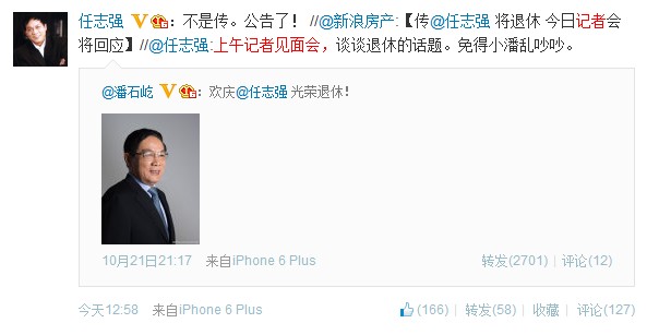 據(jù)南方都市報消息,昨晚地產(chǎn)商潘石屹發(fā)微博稱:“歡慶@任志強光榮退休!”隨后,地產(chǎn)大佬、華遠地產(chǎn)董事長任志強通過微博回應,公司已公告新的董事人選,還有一個月。關(guān)于退休生活,他說,“咱也準備改行弄點學術(shù)研究,當個啥作家”。
