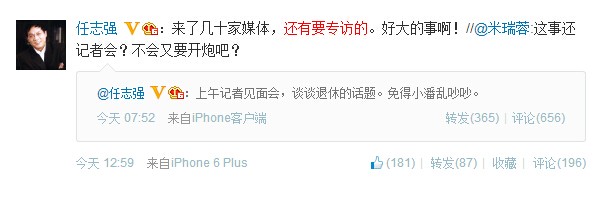 任志強現(xiàn)在很像段子手了,說記者不要把退休當成死了一樣,最少還有幾年吧。