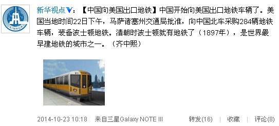 據(jù)新華視點微博報道,中國開始向美國出口地鐵車輛了。美國當(dāng)?shù)貢r間22日下午,馬薩諸塞州交通局批準(zhǔn),向中國北車采購284輛地鐵車輛,裝備波士頓地鐵。清朝時波士頓就有地鐵了(1897年),是世界最早建地鐵的城市之一。