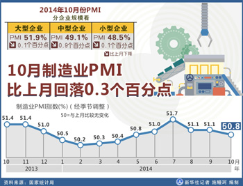 中國物流與采購聯(lián)合會、國家統(tǒng)計局服務業(yè)調查中心11月1日發(fā)布的數(shù)據(jù)顯示,2014年10月中國制造業(yè)采購經理指數(shù)(PMI)為50.8%,較上月回落0.3個百分點,為5個月新低。多方分析認為,PMI未能如預期回升,預示著當前市場內生動力仍弱。受益于近期陸續(xù)出臺的調控政策,四季度經濟增長可能基本保持平穩(wěn),但隨著政策效力消退,明年中國經濟將面臨更嚴峻考驗。
