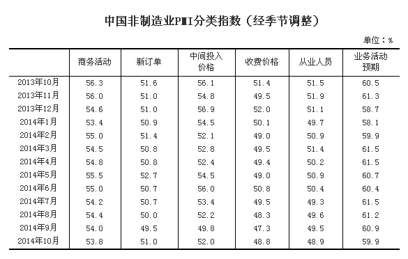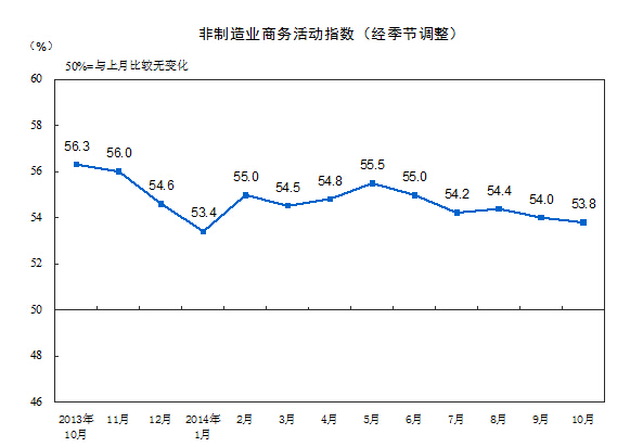 2014年10月,中國非制造業(yè)商務活動指數(shù)為53.8%,比上月回落0.2個百分點,高于榮枯線3.8個百分點,表明我國非制造業(yè)繼續(xù)保持擴張態(tài)勢。