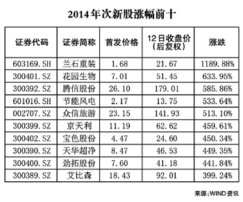 WIND統(tǒng)計(jì)數(shù)據(jù)顯示,截至目前,今年以來(lái)A股共計(jì)有103只新股上市,平均發(fā)行價(jià)格為17.84元,平均發(fā)行市盈率(攤。﹦t為24.17倍。上述103只新股上市首日的平均漲幅為43.42%,上市以來(lái)的平均漲幅則為206.91%。在這103只新股中,有98只上市首日觸及了44%的漲幅上限。除了蘭石重裝之外,包括花園生物、騰信股份、節(jié)能風(fēng)能和眾信旅游在內(nèi)的4只新股的累計(jì)漲幅均超過500%。