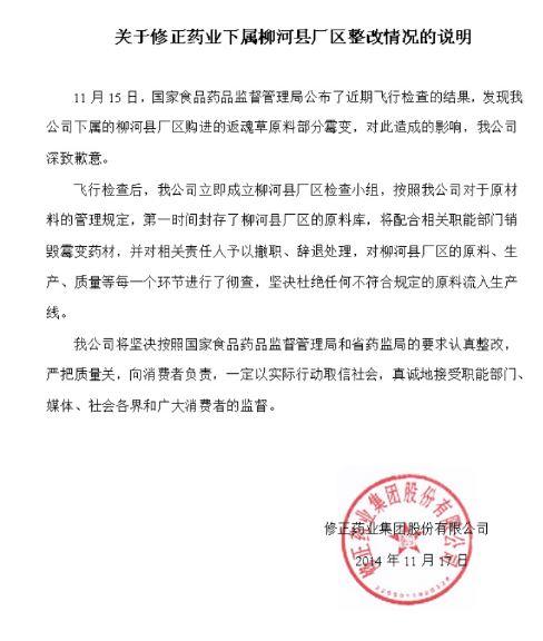 但對(duì)于之前國(guó)家食藥監(jiān)局提出的修正藥業(yè)存在故意編造虛假檢驗(yàn)報(bào)告行為,已要求吉林省局依法收回其藥品GMP證書(shū)的通報(bào),修正藥業(yè)在聲明中并未做出相應(yīng)回復(fù)。