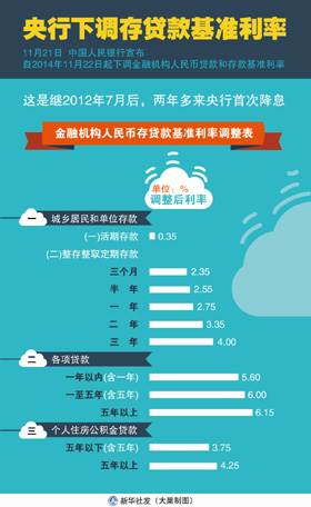 央行近日宣布,自2014年11月22日起下調(diào)金融機構(gòu)人民幣貸款和存款基準利率。金融機構(gòu)一年期貸款基準利率下調(diào)0.4個百分點至5.6%;一年期存款基準利率下調(diào)0.25個百分點至2.75%。與此同時,央行宣布,結(jié)合推進利率市場化改革,將金融機構(gòu)存款利率浮動區(qū)間的上限由存款基準利率的1.1倍調(diào)整為1.2倍。