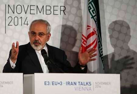 圖為11月24日,在奧地利維也納,伊朗外長(zhǎng)扎里夫出席新聞發(fā)布會(huì)。