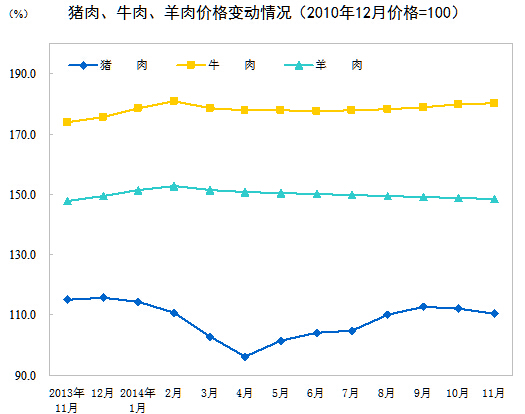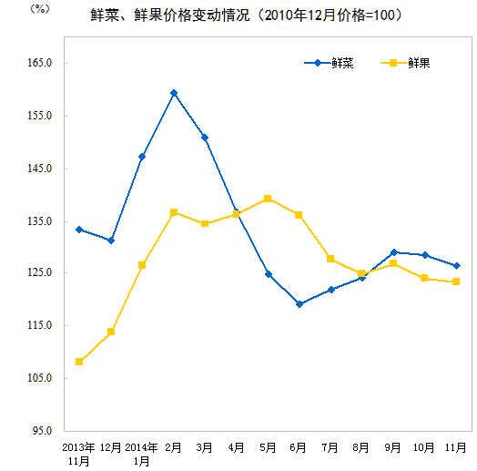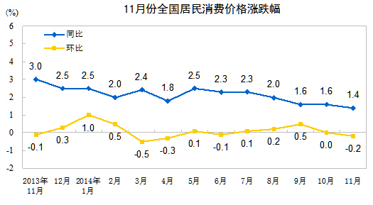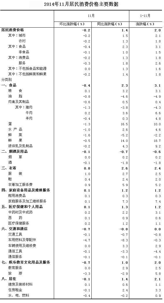 2014年11月份,全國居民消費價格總水平同比上漲1.4%。其中,城市上漲1.5%,農(nóng)村上漲1.3%;食品價格上漲2.3%,非食品價格上漲1.0%;消費品價格上漲1.3%,服務(wù)價格上漲1.8%。1-11月平均,全國居民消費價格總水平比去年同期上漲2.0%。