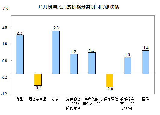 據(jù)測算,在11月份1.4%的居民消費價格總水平同比漲幅中,去年價格上漲的翹尾因素約為0.3個百分點,新漲價因素約為1.1個百分點。