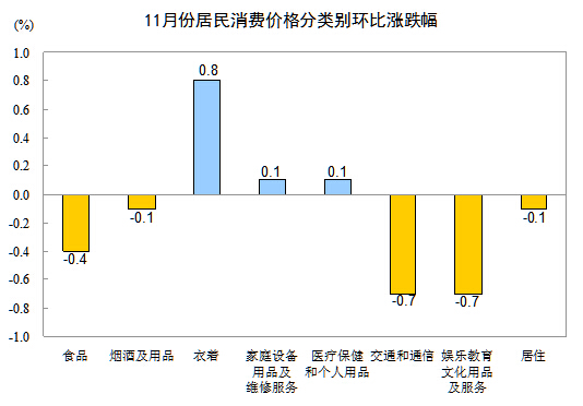 11月份,非食品價格環(huán)比下降0.1%。其中,交通和通信、娛樂教育文化用品及服務(wù)、煙酒及用品、居住價格分別下降0.7%、0.7%、0.1%和0.1%;衣著、家庭設(shè)備用品及維修服務(wù)、醫(yī)療保健和個人用品價格分別上漲0.8%、0.1%和0.1%。