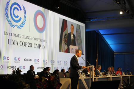 聯(lián)合國(guó)氣候大會(huì)高級(jí)別會(huì)議12月9日在秘魯首都利馬開幕,聯(lián)合國(guó)秘書長(zhǎng)潘基文呼吁達(dá)成氣候變化協(xié)議草案并最終在巴黎氣候大會(huì)上獲得通過。圖為潘基文在會(huì)上講話。