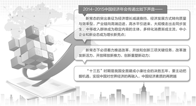 在認(rèn)識新常態(tài)、適應(yīng)新常態(tài)、引領(lǐng)新常態(tài)的“大邏輯”下,中國經(jīng)濟要秉持怎樣的發(fā)展新理念?從何發(fā)掘經(jīng)濟發(fā)展新動力?如何營造經(jīng)濟發(fā)展新環(huán)境?12月21日舉行的2014-2015中國經(jīng)濟年會上,與會專家學(xué)者展開了一場腦力激蕩——