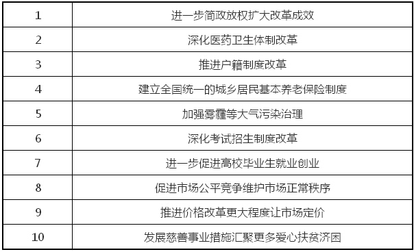 根據(jù)網(wǎng)友投票與留言情況,2014年網(wǎng)友最關(guān)心的國(guó)務(wù)院十大政策如下: