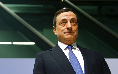 歐洲央行1月22日宣布每月600億歐元大規(guī)模國(guó)債與其他債券購(gòu)買計(jì)劃,啟動(dòng)全面量化寬松。 圖為當(dāng)日歐洲央行行長(zhǎng)德拉吉在德國(guó)法蘭克福出席新聞發(fā)布會(huì)。