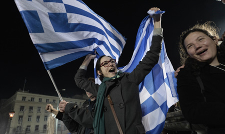 在希臘25日舉行的議會選舉中,主張結(jié)束緊縮措施、就救助協(xié)議進行重新談判的激進左翼聯(lián)盟黨獲勝,執(zhí)政的新民主黨居第二位。希臘將在二戰(zhàn)后首次出現(xiàn)左翼政黨執(zhí)政的局面。受此消息影響,歐元對美元匯率26日早盤亞洲交易時段一度跌至1.1088,為2003年9月以來最低。 圖為當日希臘激進左翼聯(lián)盟黨的支持者在首都雅典參加慶祝集會!