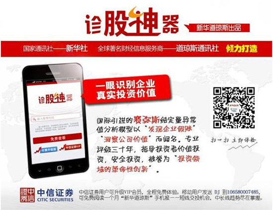 想聽見股市花開的聲音么?掃描圖片中二維碼,即刻關(guān)注“新華道瓊斯”微信服務(wù)號!輸入股票代碼,秒查個股投資財(cái)務(wù)安全評級!