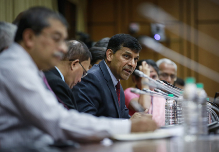 印度央行3日舉行貨幣政策會議決定,維持7.75%的基準(zhǔn)利率不變。印度央行行長拉詹說,該行正在等待印度通脹進一步放緩的跡象,及政府定于2月28日發(fā)布的年度預(yù)算。 圖為當(dāng)日在印度孟買,拉詹在新聞發(fā)布會上講話。