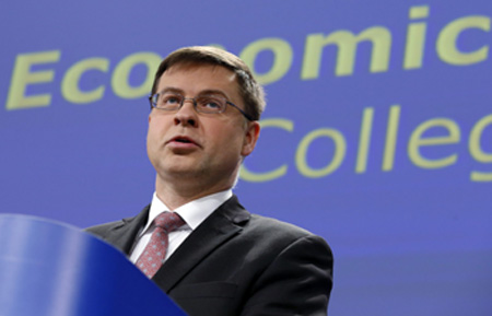 2月25日,在比利時首都布魯塞爾,歐盟委員會副主席、負(fù)責(zé)歐元與社會事務(wù)的委員東布羅夫斯基出席新聞發(fā)布會。 東布羅夫斯基當(dāng)日在新聞發(fā)布會上表示,歐委會決定同意歐元區(qū)第二大經(jīng)濟(jì)體法國推遲兩年至2017年實(shí)現(xiàn)歐盟規(guī)定的減赤目標(biāo)。