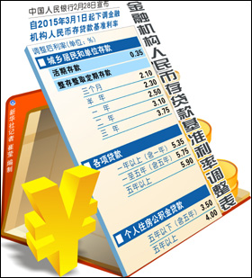 距離上次降息3個(gè)月之后,央行再次宣布降息:自2015年3月1日起下調(diào)金融機(jī)構(gòu)人民幣貸款和存款基準(zhǔn)利率。金融機(jī)構(gòu)一年期貸款基準(zhǔn)利率下調(diào)0.25個(gè)百分點(diǎn)至5.35%;一年期存款基準(zhǔn)利率下調(diào)0.25個(gè)百分點(diǎn)至2.5%,同時(shí)結(jié)合推進(jìn)利率市場(chǎng)化改革,將金融機(jī)構(gòu)存款利率浮動(dòng)區(qū)間的上限由存款基準(zhǔn)利率的1.2倍調(diào)整為1.3倍。