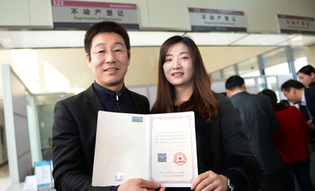 3月1日,《不動產登記暫行條例》開始施行。國土資源部部長姜大明在江蘇徐州市為申請領證的市民頒發(fā)了全國第一本不動產權證書。圖為當日在江蘇徐州市不動產登記交易服務中心,市民邢衛(wèi)鋒、趙媛媛夫婦在展示編號為001的不動產權證書。