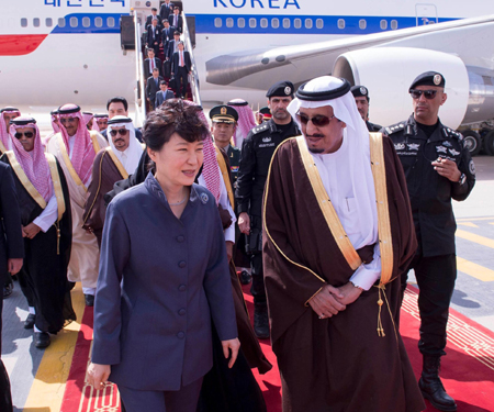 3月3日,沙特阿拉伯國王薩勒曼(前右)在首都利雅得迎接到訪的韓國總統(tǒng)樸槿惠(前左)。 據(jù)沙特國家通訊社報道,薩勒曼當(dāng)天與樸槿惠就雙邊關(guān)系舉行會談,雙方表示將進一步加強在各個領(lǐng)域的友好合作。會談后,在薩勒曼和樸槿惠的主持下,兩國相關(guān)部門簽署了關(guān)于海洋運輸和核能建設(shè)的合作諒解備忘錄。