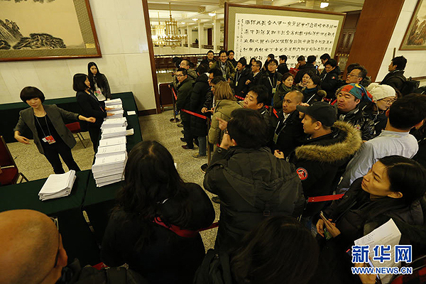 3月5日,第十二屆全國人民代表大會第三次會議在北京人民大會堂開幕。這是媒體記者排隊領(lǐng)取政府工作報告等文件。 新華社記者 沈伯韓 攝