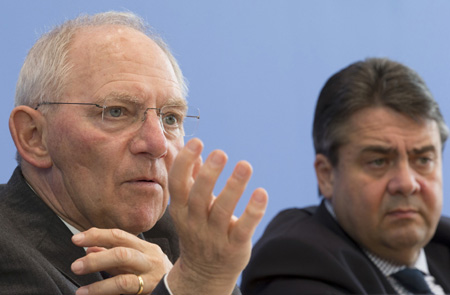 3月18日,在德國柏林,德國財政部長朔伊布勒(左)和經(jīng)濟(jì)部長加布里爾出席新聞發(fā)布會。 德國政府18日公布了2016年財政預(yù)算草案及到2019年的中期財政計劃草案。草案指出,2016年德政府計劃擴(kuò)大投資和支出,并將財政收支平衡目標(biāo)保持至2019年。