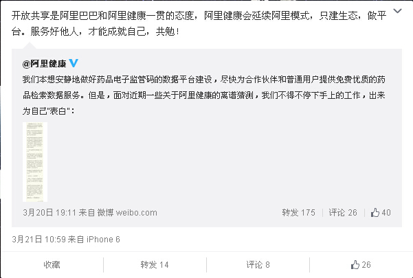 2015年3月21日,阿里巴巴官方微博轉(zhuǎn)發(fā)阿里健康官方認(rèn)證微博聲明表示,“開(kāi)放共享是阿里巴巴和阿里健康一貫的態(tài)度,阿里健康會(huì)延續(xù)阿里模式,只建生態(tài),做平臺(tái)。服務(wù)好他人,才能成就自己,共勉”。而其轉(zhuǎn)發(fā)的阿里健康長(zhǎng)微博內(nèi)容則稱,阿里健康是在國(guó)家食藥監(jiān)總局指導(dǎo)下,進(jìn)行中國(guó)藥品電子監(jiān)管碼的數(shù)據(jù)平臺(tái)建設(shè),并且正在按照食藥監(jiān)總局的要求,逐步開(kāi)放免費(fèi)的數(shù)據(jù)服務(wù)。