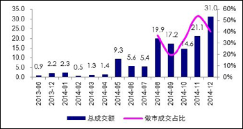數(shù)據(jù)顯示,新三板的掛牌企業(yè)“量質(zhì)齊增”,市場容量不斷擴大。在三板大擴容帶動下,掛牌企業(yè)數(shù)呈幾何式增長,由2013年底的355家增至2014年底的1588家;總股本也由2013年底的121.54億股增至2014年底的677.72億股,同比增長457.59%。在掛牌企業(yè)盈利方面,2014年掛牌企業(yè)平均營業(yè)收入和凈利潤分別為1.26億元、823.34萬元,同比增長44.63%、35.92%;掛牌企業(yè)的行業(yè)種類也日趨多樣化,截至2014年12月31日,共有27家批發(fā)零售企業(yè)、16家交運企業(yè)和12家金融企業(yè)在股轉(zhuǎn)系統(tǒng)掛牌,制造業(yè)掛牌企業(yè)占比也由2013年底的42.65%提升至2014年底的56.11%。