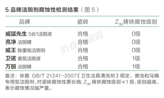 21241-2007《衛(wèi)生潔具清洗劑》測試5款潔廁劑對瓷磚和鑄鐵的腐蝕性,檢測結(jié)果顯示:5款潔廁劑對瓷磚的腐蝕性均判定為合格,但是對金屬的腐蝕性存在差異。衛(wèi)諾和萬麗兩品牌潔廁劑對金屬的腐蝕性較其他3品牌更大。