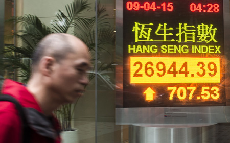4月9日,一名行人從香港灣仔一家銀行的恒生指數(shù)電子顯示屏前走過。 當(dāng)日,港股承接強(qiáng)勢,收市報26944.39點(diǎn),全日升707.53點(diǎn),升幅2.7%。主板成交再創(chuàng)歷史新高,達(dá)2915億港元!案酃赏ā眴稳疹~度再次用盡,比前一交易日提早23分鐘。