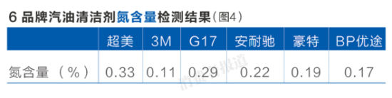 在汽油清潔劑的國家標準中,并無對氮含量作出具體的限值要求。此次的檢測結(jié)果顯示,6款受測產(chǎn)品的氮含量均較少。